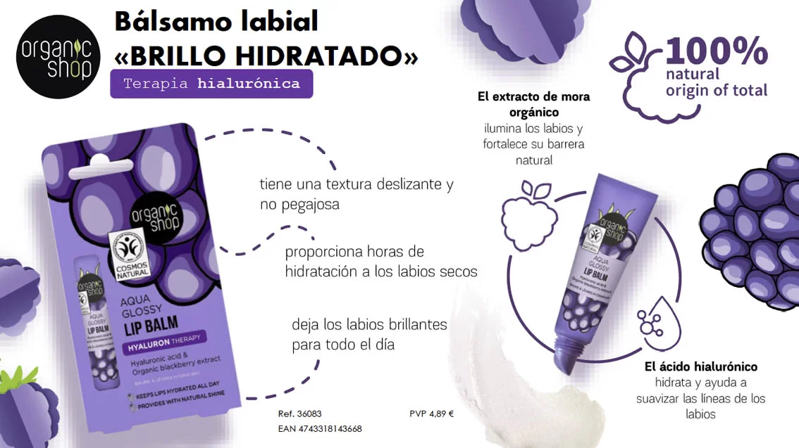 BÁLSAMO LABIAL BRILLO AQUA CON ÁCIDO HIALURÓNICO Y EXTRACTO DE MORA